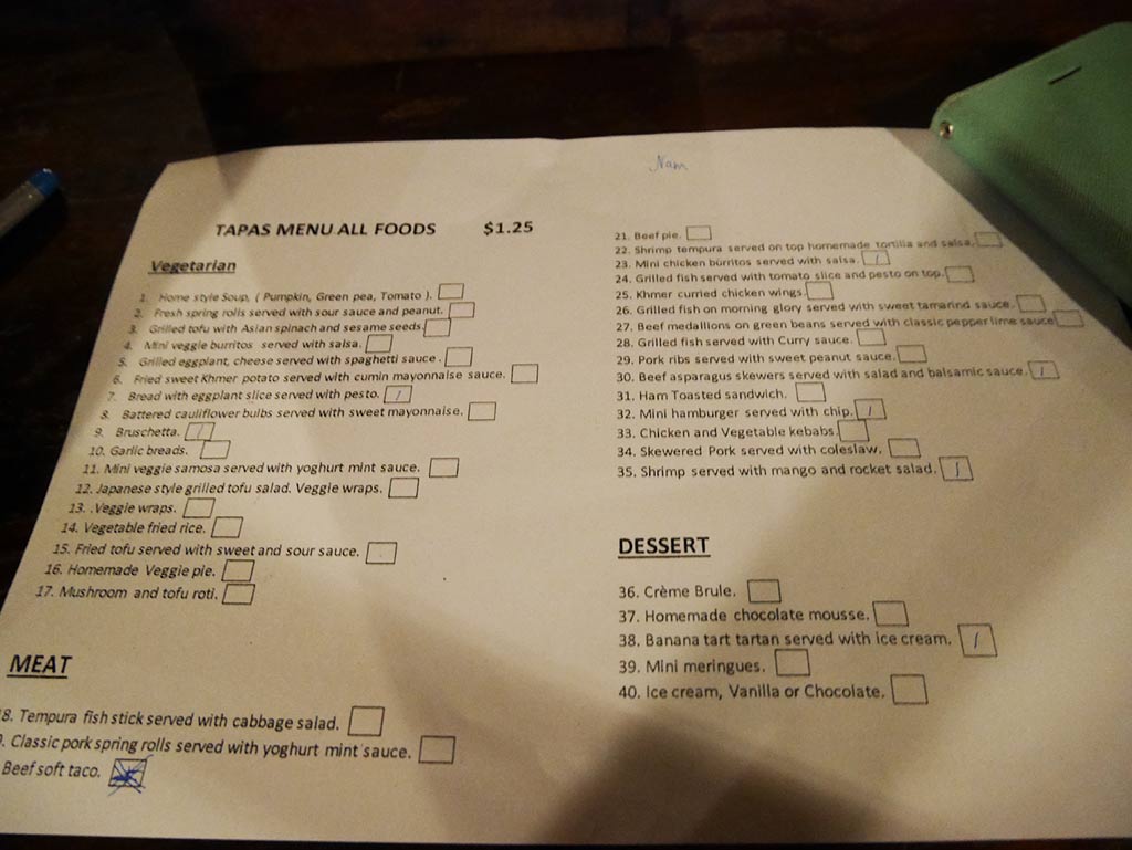 在一個住在暹粒的朋友介紹下,我去了Ivy’s Guesthouse & Bar每星期六晚都有的西班牙tapas night(也就是前菜)。每一碟也只需1.25美金,它的分量也不少,而且也有甜品和雞尾酒。我們低估了它的分量,所以吃了太多。整體來說真的價廉物美,可是有一些菜像是漢堡包一般。不過要知柬埔寨的牛少,所以要求不能太高。