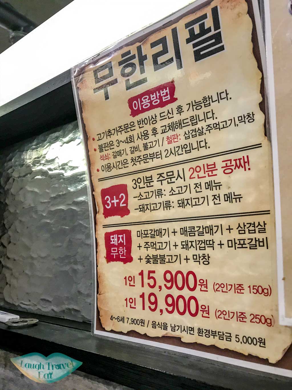 在退韓服後我們回酒店休息了一下再找晚餐的地點,最後在附近看到這間有韓燒放題。只要15.9k won就可以吃二個小時(還是三小時)。雖然只有韓文菜單,不過有在我朋友的韓文和有圖的菜單下總算明白了有什麼可以叫有什麼不可以。