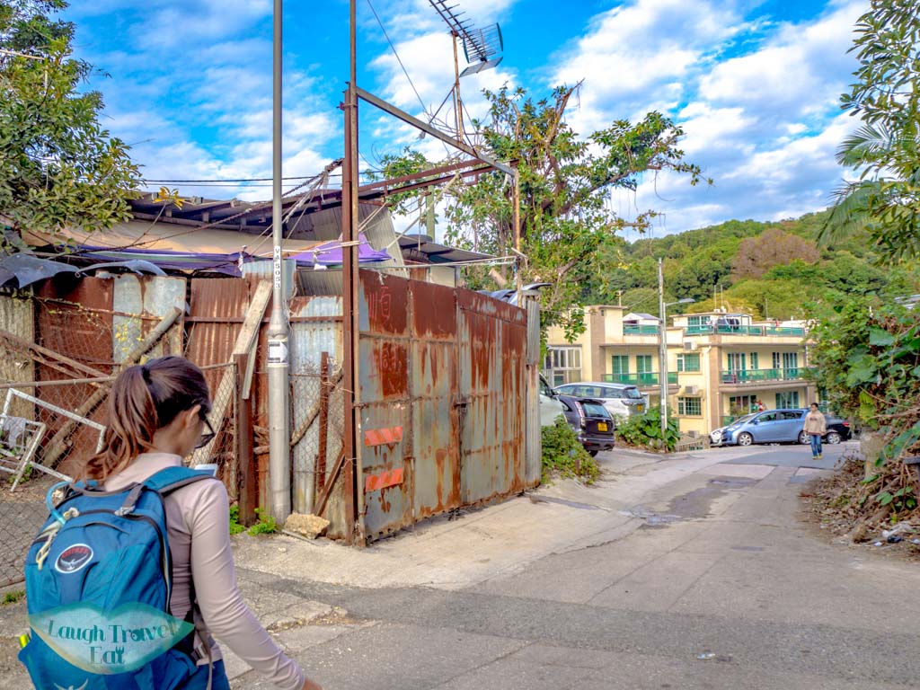 一路走過行人天橋和鯉魚門村到一座紫色的建築物前不用過馬路右轉上斜。
